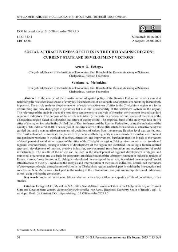 В условиях трансформации пространственной политики Российской Федерации возрастающее значение приобретают исследования, направленные на переосмысление роли городов как пространств повседневной жизни и центров устойчивого развития. В статье рассматривается феномен социальной привлекательности городов Челябинской области как фактор, определяющий не только демографическую динамику, но и устойчивость системы расселения в регионе. Актуальность исследования обусловлена необходимостью комплексного анализа городской среды за пределами стандартных экономических индикаторов. Целью статьи является выявление особенностей социальной привлекательности городов Челябинской области на основе субъективных индикаторов качества жизни. Эмпирической базой исследования послужили данные по пяти городам региона, включенным в Единый перечень опорных населенных пунктов РФ, с использованием показателей индекса качества жизни ВЭБ.РФ. Проведен анализ показателей по двум блокам (удовлетворенность жизнью и социальная привлекательность), а также проведена сравнительная оценка отклонений значений от среднероссийского уровня. Полученные результаты демонстрируют наличие выраженной неоднородности в оценках городской среды, устойчивые проблемы в сферах экологии, образования, благоустройства. Особое внимание уделено векторам развития социальной привлекательности городов Челябинской области. С учетом текущих тенденций и региональных особенностей выделены стратегические векторы развития региона, в числе которых: человекоцентричный подход, развитие туризма и креативных индустрий, экологическая трансформация и модернизация социальной инфраструктуры. Результаты статьи могут быть использованы в разработке региональных стратегий развития, муниципальных программ и в качестве основы для последующих эмпирических исследований городской среды в индустриальных регионах России. Вклад авторов. А.О. Ужегов – разработка концепции статьи, выработка понятия «социальная привлекательность города», анализ и интерпретация исследуемых показателей, определение векторов развития социальной привлекательности городов Челябинской области, принятие участия в подготовке введения и заключения; С.А. Меленькина – подготовка введения, анализ и интерпретации показателей, заключение.
