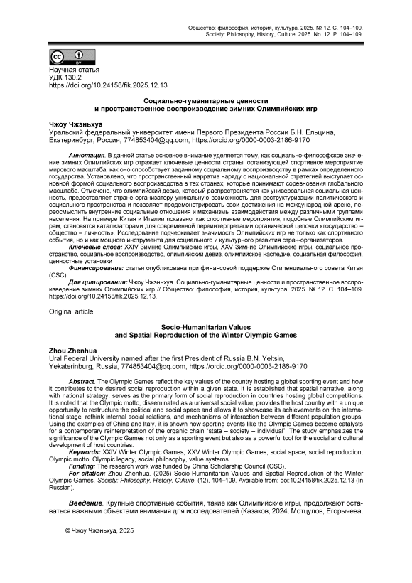 В данной статье основное внимание уделяется тому, как социально-философское значение зимних Олимпийских игр отражает ключевые ценности страны, организующей спортивное мероприятие мирового масштаба, как оно способствует заданному социальному воспроизводству в рамках определенного государства. Установлено, что пространственный нарратив наряду с национальной стратегией выступает основной формой социального воспроизводства в тех странах, которые принимают соревнования глобального масштаба. Отмечено, что олимпийский девиз, который распространяется как универсальная социальная ценность, предоставляет стране-организатору уникальную возможность для реструктуризации политического и социального пространства и позволяет продемонстрировать свои достижения на международной арене, переосмыслить внутренние социальные отношения и механизмы взаимодействия между различными группами населения. На примере Китая и Италии показано, как спортивные мероприятия, подобные Олимпийским играм, становятся катализаторами для современной переинтерпретации органической цепочки «государство – общество – личность». Исследование подчеркивает значимость Олимпийских игр не только как спортивного события, но и как мощного инструмента для социального и культурного развития стран-организаторов.