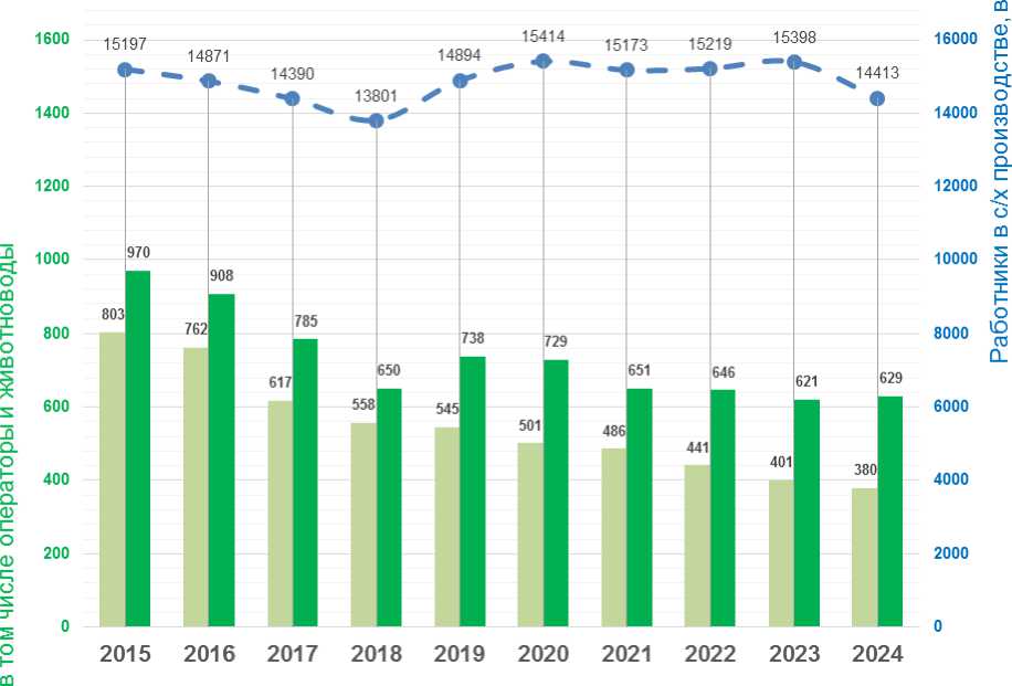 Среднегодовая численность работников, занятых в сельскохозяйственном производстве, снижается и в сельскохозяйственных организациях Орловской области. За 2021-2024 гг. снижение составила 5,0%. Уменьшается численность работников и в основных отраслях. Так, например, за годы реализации Программы развития сельского хозяйства, среднегодовая численность работников отрасли молочного животноводства в Орловской области существенно снизилась - операторов машинного доения на 39,5% и животноводов на 32,9%. Только за 2021-2024 гг. это снижение составило соответственно - операторов машинного доения 21,8% и животноводов 3,4% (рисунок 1).
