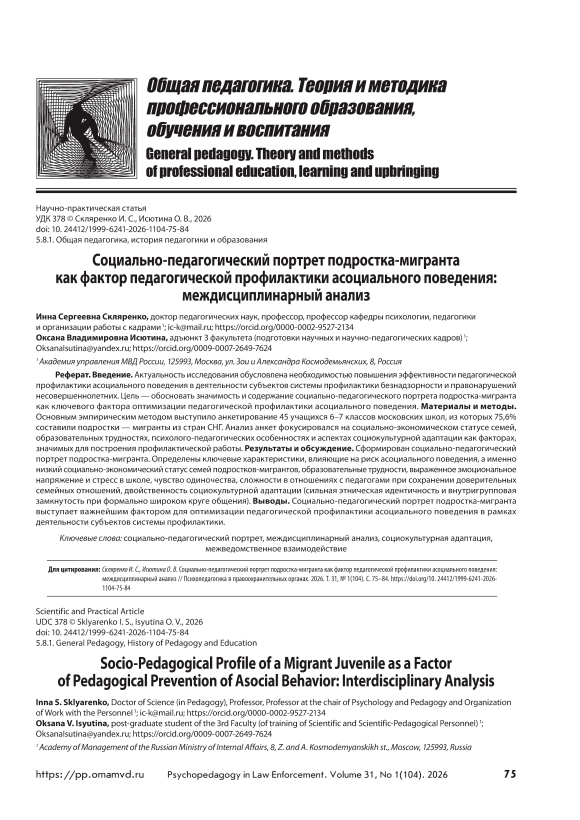 Введение. Актуальность исследования обусловлена необходимостью повышения эффективности педагогической профилактики асоциального поведения в деятельности субъектов системы профилактики безнадзорности и правонарушений несовершеннолетних. Цель — обосновать значимость и содержание социально-педагогического портрета подростка-мигранта как ключевого фактора оптимизации педагогической профилактики асоциального поведения. Материалы и методы. Основным эмпирическим методом выступило анкетирование 45 учащихся 6–7 классов московских школ, из которых 75,6% составили подростки — мигранты из стран СНГ. Анализ анкет фокусировался на социально-экономическом статусе семей, образовательных трудностях, психолого-педагогических особенностях и аспектах социокультурной адаптации как факторах, значимых для построения профилактической работы. Результаты и обсуждение. Сформирован социально-педагогический портрет подростка-мигранта. Определены ключевые характеристики, влияющие на риск асоциального поведения, а именно низкий социально-экономический статус семей подростков-мигрантов, образовательные трудности, выраженное эмоциональное напряжение и стресс в школе, чувство одиночества, сложности в отношениях с педагогами при сохранении доверительных семейных отношений, двойственность социокультурной адаптации (сильная этническая идентичность и внутригрупповая замкнутость при формально широком круге общения). Выводы. Социально-педагогический портрет подростка-мигранта выступает важнейшим фактором для оптимизации педагогической профилактики асоциального поведения в рамках деятельности субъектов системы профилактики.