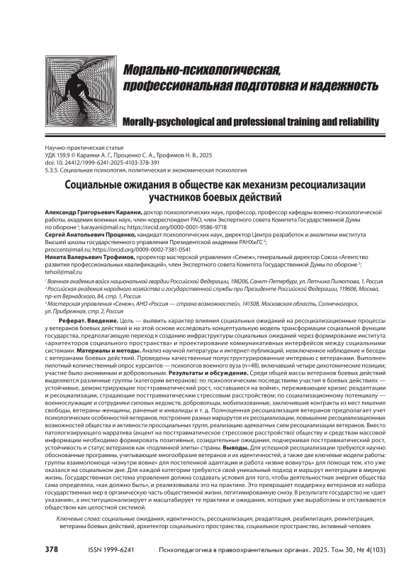 Введение. Цель — выявить характер влияния социальных ожиданий на ресоциализационные процессы у ветеранов боевых действий и на этой основе исследовать концептуальную модель трансформации социальной функции государства, предполагающую переход к созданию инфраструктуры социальных ожиданий через формирование института «архитекторов социального пространства» и проектирование коммуникативных интерфейсов между социальными системами. Материалы и методы. Анализ научной литературы и интернет-публикаций, невключенное наблюдение и беседы с ветеранами боевых действий. Проведены качественные полуструктурированные интервью с ветеранами. Выполнен пилотный количественный опрос курсантов — психологов военного вуза (n=48), включавший четыре дихотомические позиции; участие было анонимным и добровольным. Результаты и обсуждение. Среди общей массы ветеранов боевых действий выделяются различные группы (категории ветеранов): по психологическим последствиям участия в боевых действиях — устойчивые, демонстрирующие посттравматический рост, «оставшиеся на войне», переживающие кризис реадаптации и ресоциализации, страдающие посттравматическим стрессовым расстройством; по социализационному потенциалу — военнослужащие и сотрудники силовых ведомств, добровольцы, мобилизованные, заключившие контракты из мест лишения свободы, ветераны-женщины, раненые и инвалиды и т. д. Полноценная ресоциализация ветеранов предполагает учет психологических особенностей ветеранов, построение разных маршрутов их ресоциализации, повышение ресоциализационных возможностей общества и активности просоциальных групп, реализацию адекватных схем ресоциализации ветеранов. Вместо патологизирующего нарратива (акцент на посттравматическое стрессовое расстройство) обществу и средствам массовой информации необходимо формировать позитивные, созидательные ожидания, подчеркивая посттравматический рост, устойчивость и статус ветеранов как «подлинной элиты» страны. Выводы. Для успешной ресоциализации требуются научно обоснованные программы, учитывающие многообразие ветеранов и их идентичностей, а также две ключевые модели работы: группы взаимопомощи «изнутри вовне» для постепенной адаптации и работа «извне вовнутрь» для помощи тем, кто уже оказался на социальном дне. Для каждой категории требуются свой уникальный подход и маршрут интеграции в мирную жизнь. Государственная система управления должна создавать условия для того, чтобы деятельностная энергия общества сама определяла, «как должно быть», и реализовывала это на практике. Это превращает поддержку ветеранов из набора государственных мер в органическую часть общественной жизни, легитимированную снизу. В результате государство не «дает указания», а институционализирует и масштабирует те практики и ожидания, которые уже выработаны и отстаиваются обществом как целостной системой.