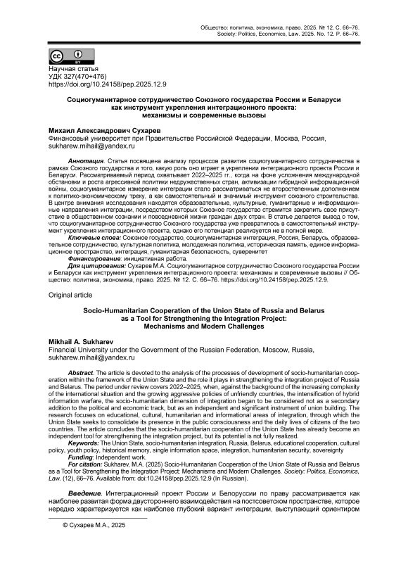 Статья посвящена анализу процессов развития социогуманитарного сотрудничества в рамках Союзного государства и того, какую роль оно играет в укреплении интеграционного проекта России и Беларуси. Рассматриваемый период охватывает 2022–2025 гг., когда на фоне усложнения международной обстановки и роста агрессивной политики недружественных стран, активизации гибридной информационной войны, социогуманитарное измерение интеграции стало рассматриваться не второстепенным дополнением к политико-экономическому треку, а как самостоятельный и значимый инструмент союзного строительства. В центре внимания исследования находятся образовательные, культурные, гуманитарные и информационные направления интеграции, посредством которых Союзное государство стремится закрепить свое присутствие в общественном сознании и повседневной жизни граждан двух стран. В статье делается вывод о том, что социогуманитарное сотрудничество Союзного государства уже превратилось в самостоятельный инструмент укрепления интеграционного проекта, однако его потенциал реализуется не в полной мере.