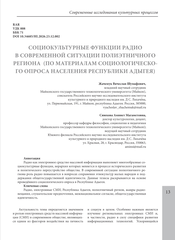 Socio-cultural functions of radio in the modern situation of a multiethnic region (based on the materials of a sociological survey of the population of the Republic of Adygea)