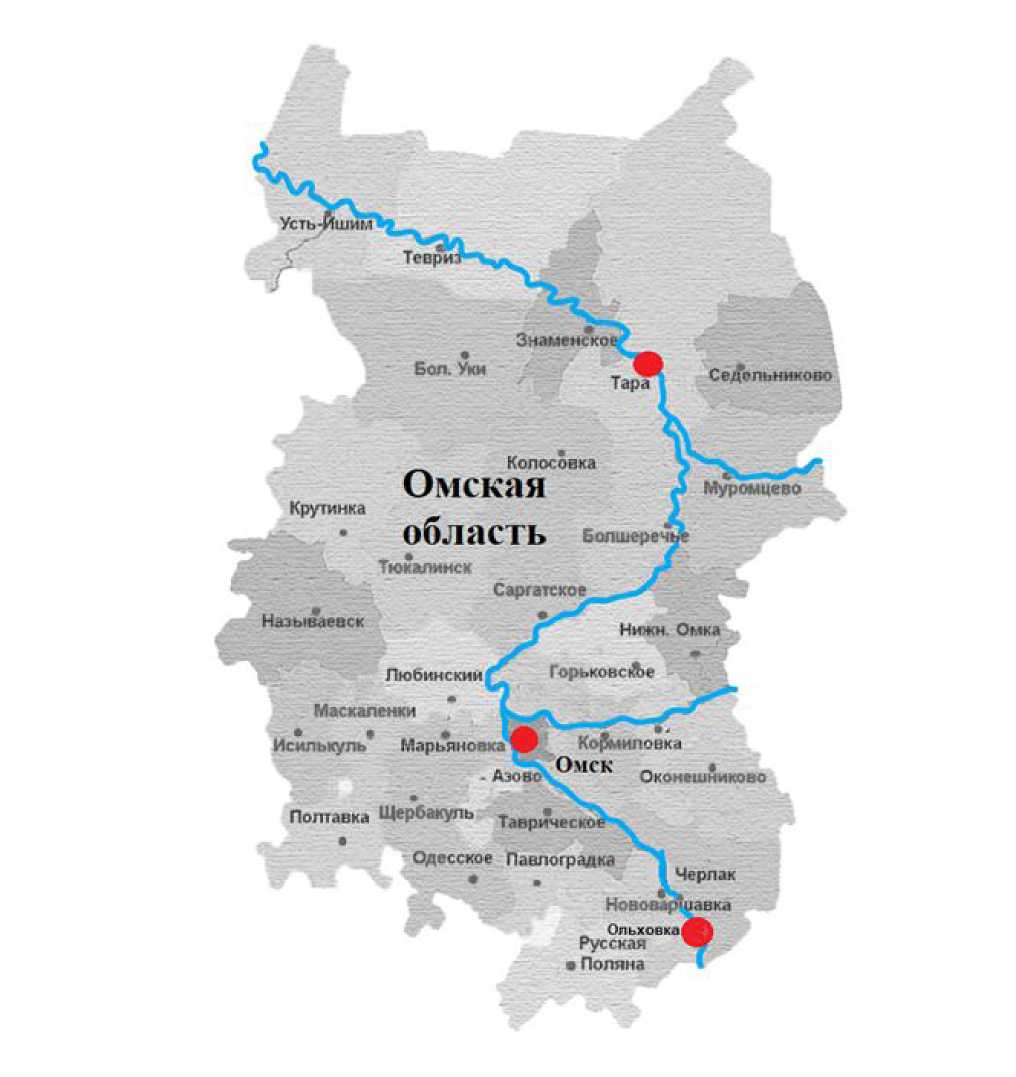 В статье использованы материалы анализа содержания тяжелых металлов в образцах тканей и печени промысловых видов рыб, выловленных в среднем течении р. Иртыш на территории Омской области. Отбор проб гидробионтов проводился с конца августа по сентябрь 2024 г. в трех створах наблюдений на р. Иртыш: выше г. Омска (д. Ольховка, Черлакский район, граница с Республикой Казахстан), в пределах г. Омска и ниже г. Омска (г. Тара, Тарский район) (рис. 1).