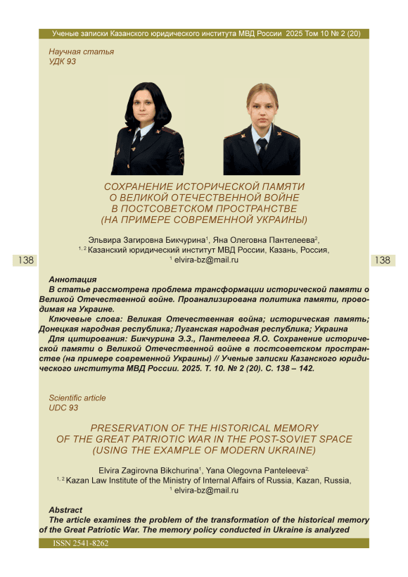 Распад Советского Союза предоставил Западу уникальную возможность для пересмотра и в некоторых случаях искажения исторических нарративов. Этот процесс, обусловленный геополитическими изменениями и трансформацией глобальной политической системы, привел к значительным модификациям в интерпретации ключевых исторических со- бытий. В условиях формирования новой международной реальности западные страны активно использовали данный исторический контекст для продвижения своих политических и идеологических интересов, что, в свою очередь, способствовало переосмыслению и в ряде случаев фальсификации исторических фактов. В настоящее время этот процесс набирает обороты. В связи с этим актуальным является анализ современных тенденций трансформации исторической памяти о Великой Отечественной войне в постсоветском пространстве.