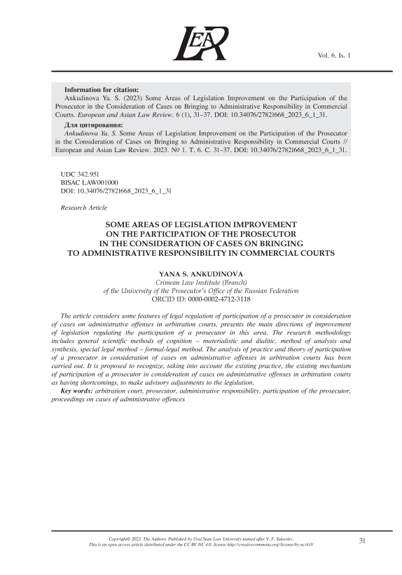 Текст статьи SOME AREAS OF LEGISLATION IMPROVEMENT ON THE PARTICIPATION OF THE PROSECUTOR IN THE CONSIDERATION OF CASES ON BRINGING TO ADMINISTRATIVE RESPONSIBILITY IN COMMERCIAL COURTS