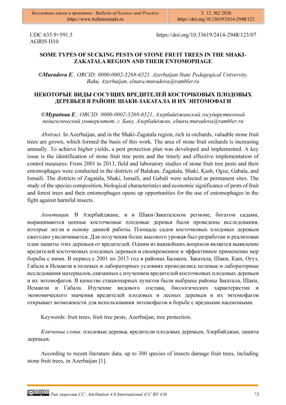 Текст научной статьи Some Types of Sucking Pests of Stone Fruit Trees in the Shaki-Zakatala Region and their Entomophage