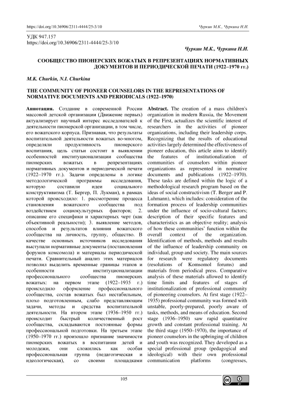 Чуркин М.К., Чуркина Н.И. Сообщество пионерских вожатых в репрезентациях нормативных документов и периодической печати (1922–1970 гг.) // Вестник Нижневартовского государственного университета. 2025. №3(71). С. 105-119.