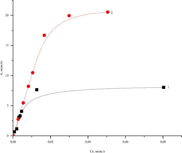 Рис. 1. Изотермы сорбции для исходного (1) и модифицированного (2) хитозана