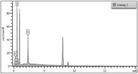 Определение элементного состава сорбента с использованием энергодисперсионного рентгеновского микроанализа (рис. 2) показало наличие серы в модифицированном образце в количестве 15 %.