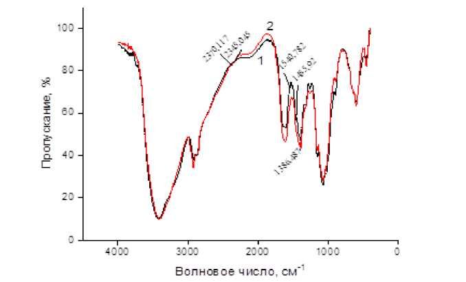 Рис. 3. ИК-спектры для исходного (1) и модифицированного (2) хитозана Fig. 3. IR spectra for the initial (1) and modified (2) chitosan