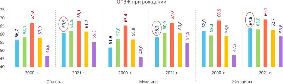 Продолжительность здоровой жизни россиян в возрасте 60 лет (12,7 года) сопоставима с показателем низкодоходных стран и ниже среднего по миру, средне- и высокодоходным странам. ОПЗЖ российских мужчин в этом возрасте ниже, чем в бедных странах, что актуализирует проблему качества здоровья представителей старших возрастов. Тем не менее с 2000 по 2021 год данный показатель среди российских мужчин продемонстрировал заметный прирост (на 6,3 года).