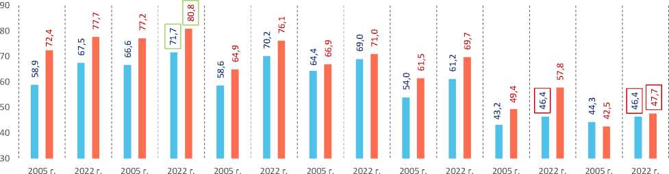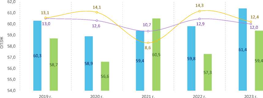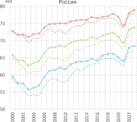 значения (73,3 года; рис. 4 ). При этом прирост ОПЖ мужчин по сравнению с 2003 годом оказался более существенным (9,4 года против 6,8 года у женщин). В 2020 году позитивная тенденция обратилась вспять: ОПЖ россиян сократилась до 71,5 года, а в 2021 году – до 70,1 года, что во многом было обусловлено возросшей смертностью от коронавирусной инфекции (Шабунова и др., 2022). При этом максимальное сокращение показателя с 2019 по 2021 год произошло среди женщин (3,7 года против 2,7 года среди мужчин). С 2022 года отмечается восстановительный рост ОПЖ.