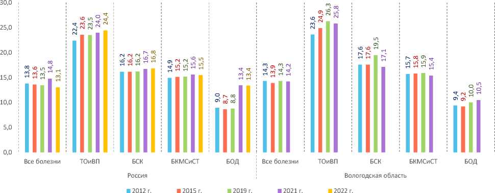 Класс причин 2000 г. 2010 г. 2019 г. 2020 г. 2021 г. 2023 г. 2023 к 2000 гг. коэф-т % коэф-т % коэф-т % коэф-т % коэф-т % коэф-т % коэф-т, % %, +/- Россия Все причины 730,5 100,0 780,0 100,0 774,3 100,0 753,5 100,0 849,2 100,0 821,3 100,0 112,4 – БОД 317,2 43,4 324,0 41,5 353,5 45,7 367,4 48,8 403,4 47,5 408,5 49,7 128,8 +6,3 ТОиВП 86,2 11,8 91,7 11,8 89,7 11,6 80,6 10,7 82,8 9,8 87,2 10,6 101,2 -1,2 БМС 37,6 5,1 47,9 6,1 44,1 5,7 35,7 4,7 36,6 4,3 39,1 4,8 104,0 -0,3 БКиПК 44,0 6,0 48,2 6,2 40,4 5,2 33,7 4,5 35,3 4,2 37,9 4,6 86,1 -1,4 БСК 17,1 2,3 26,1 3,4 34,7 4,5 29,1 3,9 30,3 3,6 35,5 4,3 207,6 +2,0 БКМСиСТ 30,6 4,2 33,5 4,3 30,1 3,9 24,8 3,3 26,4 3,1 31,1 3,8 101,6 -0,4 БОП 32,3 4,4 33,4 4,3 31,7 4,1 26,1 3,5 26,6 3,1 28,0 3,4 86,7 -1,0 БГиПА 31,9 4,4 33,0 4,2 29,8 3,9 23,7 3,2 24,7 2,9 26,1 3,2 81,8 -1,2 БУиСО 21,9 3,0 27,1 4,2 24,8 3,4 20,4 2,7 21,1 2,5 23,9 2,9 109,1 -0,1 ИПЗ 44,3 6,1 32,8 3,5 26,4 3,2 20,3 2,7 21,2 2,5 23,4 2,9 52,8 -3,2 COVID-19 — – — – — – 33,6 4,5 80,3 9,5 15,2 1,9 – – ОБ,РиПП* 52,9 – 77,2 – 60,5 – 56,5 – 56,4 – 46,3 – 87,5 – Вологодская область Все причины 837,0 100,0 886,3 100,0 996,3 100,0 948,1 100,0 1101,8 100,0 1063,0 100,0 127,0 – БОД 405,7 48,5 411,5 46,4 514,0 51,6 502,6 53,0 572,6 51,9 578,4 54,4 142,6 +5,9 ТОиВП 83,1 9,9 95,1 10,7 90,0 9,0 83,3 8,8 83,8 7,6 91,0 8,6 109,5 -1,3 БКиПК 48,7 5,8 53,5 6,0 61,9 6,2 44,5 4,7 49,5 4,5 58,1 5,5 119,3 -0,3 БКМСиСТ 32,5 3,9 40,2 4,5 45,6 4,6 39,4 4,2 38,8 3,5 45,0 4,2 138,5 +0,3 БМС 29,2 3,6 38,3 4,3 36,4 3,7 33,8 3,6 35,4 3,2 41,8 3,9 143,2 +0,3 БУиСО — – 33,4 3,8 37,7 3,8 32,5 3,4 35,0 3,2 37,5 3,5 – – БГиПА — – 43,1 4,9 41,7 4,2 34,3 3,6 35,3 3,2 31,7 3,0 – – ИПЗ 53,8 6,4 38,0 4,3 37,3 3,7 27,9 2,9 29,4 2,7 29,1 2,7 54,1 -3,7 БСК 18,2 2,2 28,1 3,2 30,0 3,0 24,1 2,5 25,0 2,3 28,4 2,7 156,0 +0,5 БОП 24,4 2,9 27,6 3,1 30,6 3,1 25,4 2,7 26,3 2,4 27,6 2,6 113,1 -0,3 COVID-19 — – — – — – 34,1 3,6 100,0 9,1 15,0 1,4 – – ОБ, РиПП* 43,4 – 64,6 – 41,1 – 40,2 – 41,3 – 33,8 – 77,9 – Ранжировано по показателям 2023 года. * На 1000 женщин в возрасте 15–49 лет. Примечание: ОБ, РиПП – осложнения беременности, родов и послеродового периода. Составлено по: Регионы России. Социально-экономические показатели / Росстат. URL: document/13204; Статистический ежегодник Вологодской области. 2022: статистический сборник (2023). Вологда: Вологдастат. 335 с.; Заболеваемость всего населения России в 2023 году с диагнозом, установленным впервые в жизни: статистические материалы (2024). М.: ЦНИИОИЗ Минздрава России. 152 с.
