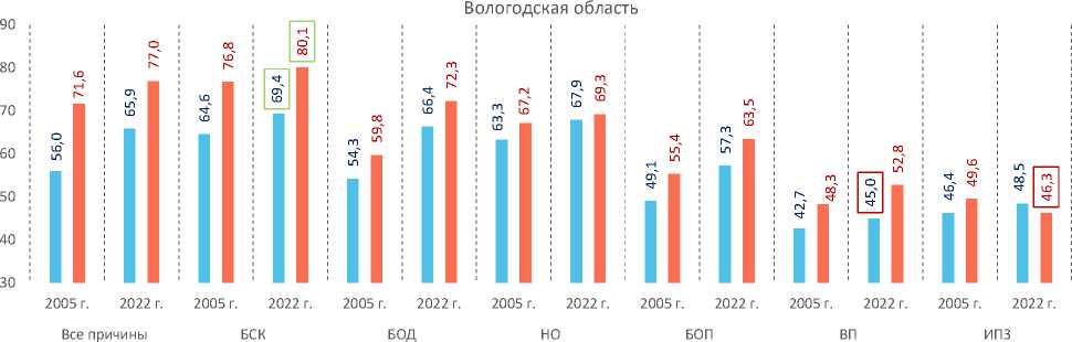 Причина 2000 г. 2010 г. 2016 г. 2018 г. 2020 г. 2022 г. 2022 к 2000 гг. коэф-т % коэф-т % коэф-т % коэф-т % коэф-т % коэф-т % коэф-т, % %, +/- Россия Все причины 98,5 100,0 76,6 100,0 56,8 100,0 54,9 100,0 45,8 100,0 48,6 100,0 49,3 – ЗНО 12,6 12,8 15,6 20,4 18,1 31,8 18,4 33,5 16,9 35,1 17,5 35,9 138,9 +23,1 БСК 45,4 46,1 30,0 39,2 17,6 31,1 16,5 30,0 14,4 29,8 13,5 27,7 29,7 -18,4 БКМСиСТ 6,6 6,7 7,2 9,4 3,6 6,3 3,2 5,9 2,9 6,0 3,2 6,5 48,5 -0,2 ПРиРП 4,3 4,4 3,2 4,1 2,7 4,8 2,7 4,9 2,2 4,6 2,2 4,6 51,2 +0,2 БНС 3,1 3,2 2,7 3,5 2,2 3,9 2,2 4,0 1,9 4,0 2,1 4,3 67,7 +1,1 ПТОиВП 6,3 1,0 4,5 5,9 2,2 3,8 1,7 3,2 1,5 3,1 1,4 2,9 22,2 +1,9 в т. ч. произв. травм 1,0 0,4 0,4 0,5 0,2 0,3 0,1 0,2 0,1 0,3 0,1 0,2 10,0 -0,2 Вологодская область Все причины 163,0 100,0 98,1 100,0 55,1 100,0 52,4 100,0 53,1 100,0 52,7 100,0 32,3 – БСК 92,9 57,0 43,7 44,5 18,0 32,7 17,0 32,4 16,7 33,4 16,7 31,7 18,0 -25,3 ЗНО 14,9 9,1 15,9 16,2 16,9 30,6 16,4 31,2 15,1 30,2 16,5 31,1 110,7 +22,0 БКМСиСТ н/д н/д 9,6 9,8 2,8 5,1 2,2 4,3 2,8 5,6 3,6 6,8 – – ПРиРП н/д н/д 2,5 2,6 2,4 4,4 2,5 4,8 2,6 5,3 2,7 5,0 – – БНС 7,1* 4,3 3,6 3,6 2,0 3,7 2,1 4,0 2,3 4,7 2,3 4,3 32,4 0,0 ПТОиВП 8,3 5,1 6,7 6,8 1,9 3,5 1,8 3,4 2,0 3,9 1,7 3,1 20,5 -2,0 в т. ч. произв. травм 1,7 1,1 0,6 0,6 0,2 0,4 0,2 0,5 0,2 0,4 0,3 0,6 17,6 -0,5 Ранжировано по показателям 2022 года. * Включая болезни органов чувств (глаза и его придаточного аппарата, уха и сосцевидного отростка). Примечания: ЗНО – злокачественные новообразования, ПРиРП – психические расстройства и расстройства поведения, ПТОиВП – последствия травм, отравлений и других воздействий внешних причин. Составлено по: Здравоохранение в России / Росстат. URL: ; Статистический ежегодник Вологодской области. 2022: статистический сборник (2023) // Вологдастат. Вологда. С. 141.