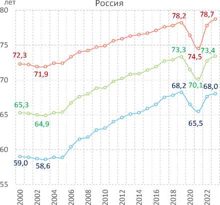 С 2000 по 2003 год ожидаемая продолжительность жизни населения России сократилась до 64,5 года, что соответствовало показателю 1994 года. С 2004 года началась тенденция ее роста, в результате к 2019 году она достигла наибольшего за период наблюдения
