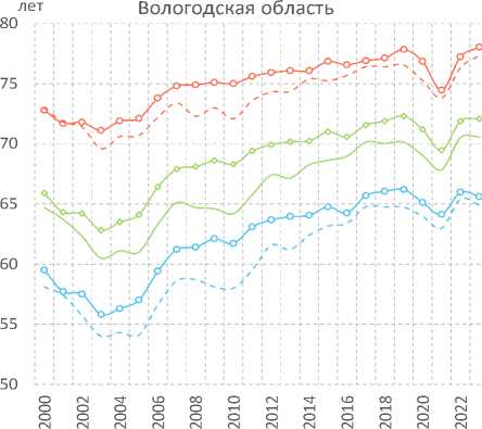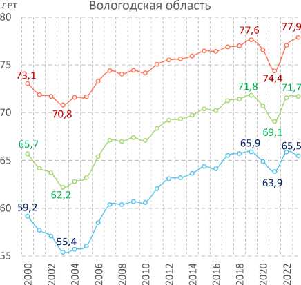 На протяжении 2000–2023 гг. в регионе наблюдались тенденции, схожие с общероссийскими: спад показателя в 2000–2003 гг., его увеличение в 2004–2019 гг., снижение в годы пандемии COVID-19 (2020–2021 гг.) и восстановительный рост с 2022 года. К специфике Вологодской области следует отнести более существенное снижение продолжительности жизни населения в 2003 году (на 3,5 года по сравнению с 2000 годом, в стране – на 0,4 года), в результате которого показатель стал уступать среднему по стране (в среднем на 1,3 года), особенно среди мужчин (в среднем на 1,9 года).