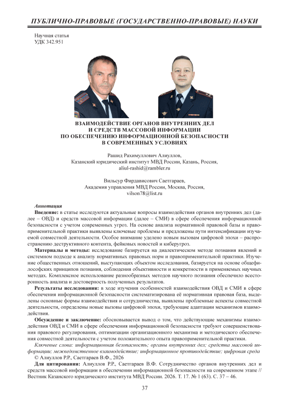 Introduction: this article examines current issues of collaboration between internal affairs agencies (hereinafter referred to as IAA) and the media (hereinafter referred to as media) in the area of information security, taking into account modern threats. Based on an analysis of the regulatory framework and law enforcement practices, key issues are identified and ways to intensify these joint activities are proposed. Particular attention is paid to new challenges of the digital age – the spread of destructive content, fake news, and cyber threats. Materials and Methods: the study is based on a dialectical method of understanding phenomena and a systems approach to the analysis of regulatory legal norms and law enforcement practice. The study of public relations, which is the object of the study, is based on general philosophical principles of cognition, objectivity, and specificity in the applied scientific methods. The integrated use of various scientific methods ensured the comprehensiveness of the analysis and the reliability of the obtained results. Research results: By studying the specifics of interaction between law enforcement agencies and the media in the area of information security, we systematized its regulatory framework, identified key forms of interaction and cooperation, identified problematic aspects of joint activities, and defined new challenges of the digital age that require adaptation of interaction mechanisms. Discussion and Conclusions: we conclude that the current mechanisms for interaction between law enforcement agencies and the media in the area of information security require improved legal regulation, optimization of organizational mechanisms, and methodological support for joint activities, taking into account positive law enforcement practices.