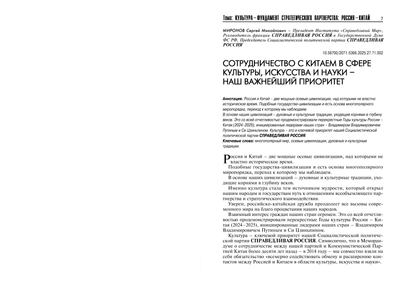 Россия и Китай - две мощные осевые цивилизации, над которыми не властно историческое время. Подобные государства-цивилизации и есть основа многополярного миропорядка, переход к которому мы наблюдаем. В основе наших цивилизаций – духовные и культурные традиции, уходящие корнями в глубину веков. Это со всей отчетливостью продемонстрировали перекрестные Годы культуры России - Китая (2024-2025), инициированные лидерами наших стран – Владимиром Владимировичем Путиным и Си Цзиньпином. Культура – это и ключевой приоритет нашей Социалистической политической партии СПРАВЕДЛИВАЯ РОССИЯ.