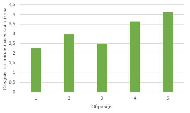 Влабораторныхусловияхбыловыработаноиисследованонесколько вариантов продукта, произведенных на одной и той же молочной основе в качестве которой использовался ультрафильтрационный концентрат пахты с массовой долей сухих веществ 20,5 %, с различным содержанием куркумы, сухого чеснока и соли. Нормализованная, пастеризованнаясмесьподвергаласьсквашиваниюзакваской,состоящей из молочнокислых микроорганизмов (Streptococcusthermophilus, Lactobacillusbulgaricus). Полученные образцы соусов оценивали с помощью метода органолептической оценки по разработанной шкале (таблица 1). Результаты балльной оценки представлены на рисунке 1.