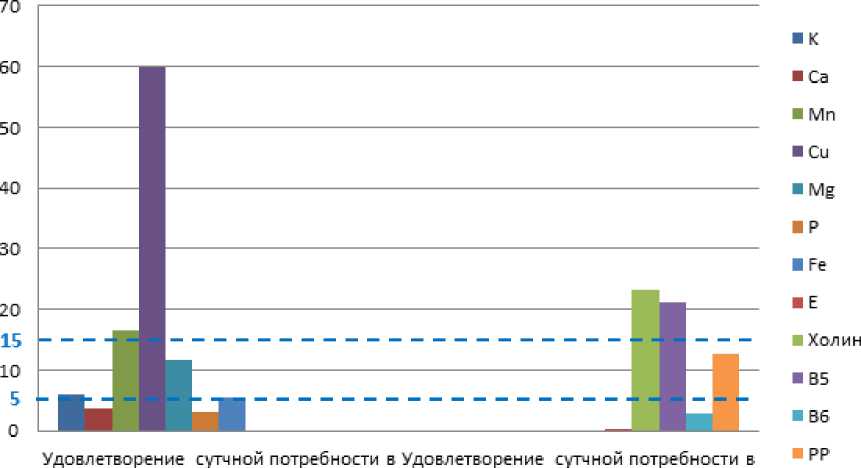 На основании полученных результатов можно заключить, что продукт является функциональным по таким микронутриентам как марганец, медь, холин и витамин В5, обогащенным калием, магнием, железом и витамином РР.