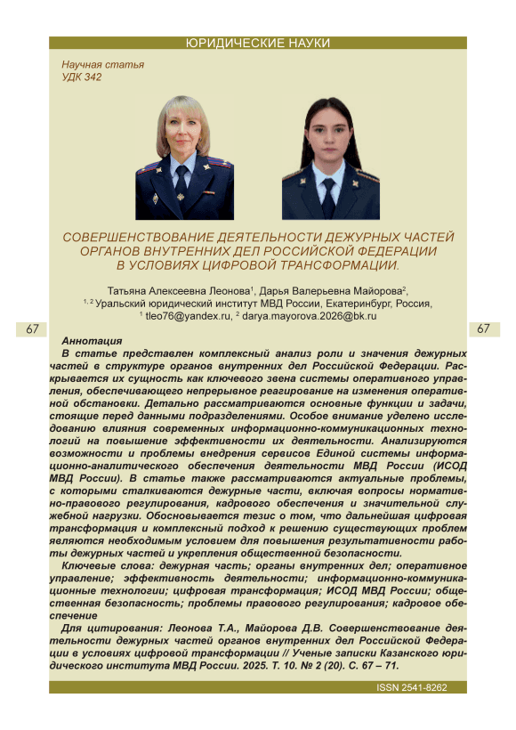 В современных условиях, характеризующихся динамичными изменениями в общественной жизни и ростом угроз криминального характера, возрастают требования к эффективности функционирования всей системы Министерства внутренних дел Российской Федерации. Центральное место в механизме оперативного реагирования на правонарушения и управления силами и средствами правопорядка занимают дежурные части органов внутренних дел (ОВД). Являясь, по сути, «нервным центром» любого территориального органа МВД России, дежурная часть обеспечивает непрерывный круглосуточный цикл управления, от слаженности и профессионализма которого напрямую зависят защищенность граждан, общества и государства. Актуальность исследования вопросов совершенствования деятельности дежурных частей обусловлена необходимостью их адаптации к вызовам цифровой эпохи. Глобальная информатизация и повсе- местное внедрение новых технологий ставят перед правоохранительными органами задачу фундаментального переосмысления традиционных подходов к организации служебной деятельности [1, c. 1]. Эффективное использование информационно-коммуникационных технологий (ИКТ) становится не просто вспомогательным инструментом, а ключевым фактором, определяющим способность дежурных частей оперативно и качественно выполнять возложенные на них функции.