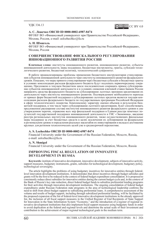 Обеспечение технологического суверенитета и инновационного развития экономики России остаются одним из главных стратегических приоритетов государственной финансовой политики. Достижению этих целей призваны способствовать различные меры и инструменты фискальной политики, от налоговых преференций, бюджетных субсидий до специальных инвестиционных контрактов, но их реализация сталкивается с определенными трудностями, обусловленными как глобальными вызовами и геополитической напряженностью [1], так и ограниченностью государственных финансовых ресурсов. В этих обстоятельствах, с учетом необходимости расширения программы импортозамеще-ния (снижение доли импорта в производстве с 2014-2024 гг. составило 21 п.п. [2]), актуальным становится совершенствование организационно-правовой базы финансовой поддержки субъектов инновационной деятельности. Не менее важными остаются вопросы повышение прозрачности отбора и оптимальности форм и инструментов финансового обеспечения их инновационных проектов через институты инновационного развития, интеграция инструментов бюджетной поддержки с деятельностью данных институтов, что также подтверждается в научных исследованиях российских ученых экономистов [3-5].