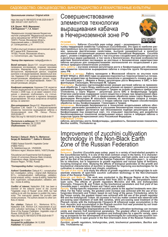 Актуальность. Кабачок (Cucurbita pepo subsp. pepo) – разновидность тыквы твердокорой семейства Тыквенные (Cucurbitaceae). Это одна из наиболее распространённых культур семейства. Он характеризуется ранним формированием урожая, ценными диетическими свойствами, высокой урожайностью и является неотъемлемой составляющей рациона населения Российской Федерации. Cucurbita pepo L. уязвим к инфекциям, вместе с тем отзывчив к воздействию регуляторов роста и различных видов удобрений, в том числе и биологических. Изучение особенностей действия биологических пестицидов на ростовые и биохимические характеристики кабачка актуально для совершенствования экотехнологий его возделывания в различных природно-климатических условиях. Цель работы – изучение влияния регуляторов роста и биофунгицидов для обоснования элементов технологии выращивания кабачка в открытом грунте Нечерноземной зоны РФ. Материал и методы. Работу проводили в Московской области на опытном поле ФГБНУ ФНЦО в 2023-2024 годах на дерново-подзолистых тяжелосуглинистых почвах. Изучали воздействие на биохимические показатели и урожайность плодов двух сортов Cucurbita pepo L. (Фараон и Якорь) регуляторов роста Микромикс и БИС, и биофунгицидов Глиокладин, Фитоспорин М, Тридем. Результаты. Выявлена сортоспецифическая реакция растений кабачка на применяемые обработки. У сорта Якорь наибольшее влияние на прирост урожайности оказало применение биофунгицидов Глиокладин и Тридем на основе почвенных грибов рода Trichoderma, у сорта Фараон – регулятора роста БИС и биофунгицида Тридем. Отмечено увеличение содержания сухого вещества в плодах при предпосевной обработке семян обоих сортов БИС, а предпосевная обработка семян сорта Фараон биофунгицидом Фитоспорин М оказывало влияние на накопление сахаров в плодах. Накоплению аскорбиновой кислоты в плодах кабачка сорта Фараон способствовала обработка почвы биофунгицидами Глиокладин и Тридем. Заключение. Интеграция биопрепаратов в технологию возделывания кабачка обеспечивает увеличение урожайности и улучшение биохимических показателей плодов. Наибольший эффект достигается при обоснованном подборе регуляторов роста и биофунгицидов под конкретный сорт, что открывает перспективы для разработки биологизированных технологий возделывания новых сортов и гибридов кабачка в открытом грунте Нечерноземной зоны Российской Федерации.