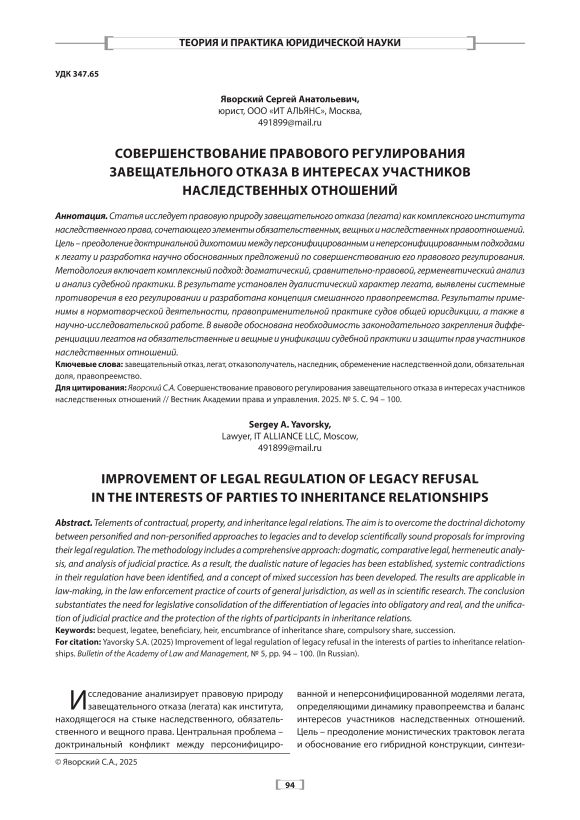 Статья исследует правовую природу завещательного отказа (легата) как комплексного института наследственного права, сочетающего элементы обязательственных, вещных и наследственных правоотношений. Цель – преодоление доктринальной дихотомии между персонифицированным и неперсонифицированным подходами к легату и разработка научно обоснованных предложений по совершенствованию его правового регулирования. Методология включает комплексный подход: догматический, сравнительно-правовой, герменевтический анализ и анализ судебной практики. В результате установлен дуалистический характер легата, выявлены системные противоречия в его регулировании и разработана концепция смешанного правопреемства. Результаты применимы в нормотворческой деятельности, правоприменительной практике судов общей юрисдикции, а также в научно-исследовательской работе. В выводе обоснована необходимость законодательного закрепления дифференциации легатов на обязательственные и вещные и унификации судебной практики и защиты прав участников наследственных отношений.