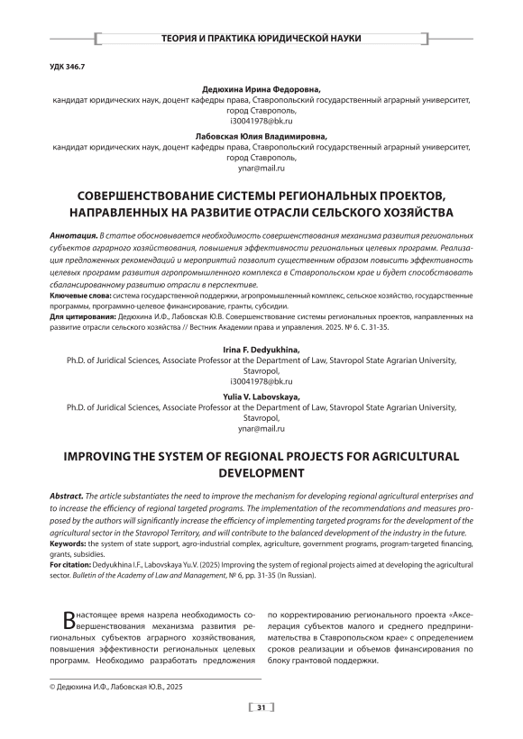 Improving the system of regional projects aimed at developing the agricultural sector.