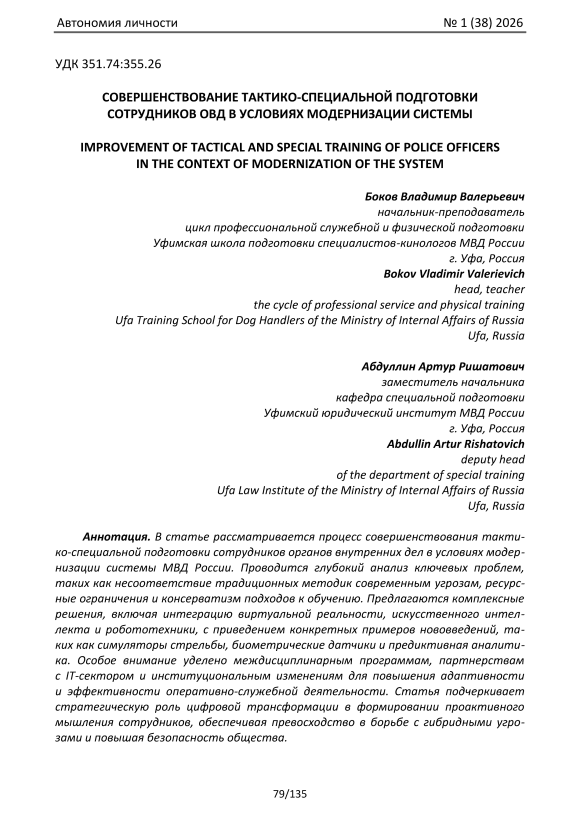 В статье рассматривается процесс совершенствования тактико-специальной подготовки сотрудников органов внутренних дел в условиях модернизации системы МВД России. Проводится глубокий анализ ключевых проблем, таких как несоответствие традиционных методик современным угрозам, ресурсные ограничения и консерватизм подходов к обучению. Предлагаются комплексные решения, включая интеграцию виртуальной реальности, искусственного интеллекта и робототехники, с приведением конкретных примеров нововведений, таких как симуляторы стрельбы, биометрические датчики и предиктивная аналитика. Особое внимание уделено междисциплинарным программам, партнерствам с IT-сектором и институциональным изменениям для повышения адаптивности и эффективности оперативно-служебной деятельности. Статья подчеркивает стратегическую роль цифровой трансформации в формировании проактивного мышления сотрудников, обеспечивая превосходство в борьбе с гибридными угрозами и повышая безопасность общества.