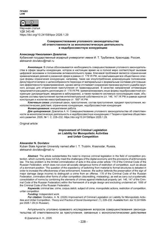 В статье обосновывается необходимость совершенствования уголовного законодательства в сфере защиты конкуренции, которое в настоящее время не в полной мере соответствует вызовам цифровой экономики и положениям антимонопольного права. Ключевой проблемой является ограниченная криминализация деяний в указанной сфере в рамках ст. 178 УК РФ, не охватывающая все общественно опасные формы ограничения конкуренции, например, такие как злоупотребление доминирующим положением. Дискутируется вопрос о целесообразности перехода от материальных к формальным составам для повышения эффективности правоприменения, однако автор отстаивает сохранение признака крупного ущерба (крупного дохода) для отграничения преступления от правонарушения. В качестве направлений оптимизации предлагается расширить диспозицию ст. 178 УК РФ, криминализировать иные формы недобросовестной конкуренции (дискредитация, введение в заблуждение), а также провести системную консолидацию норм, объединив составы преступлений против интеллектуальной собственности (ст. 146, 147 УК РФ) в рамках единой конструкции и исключив невостребованную ст. 1856 УК РФ.