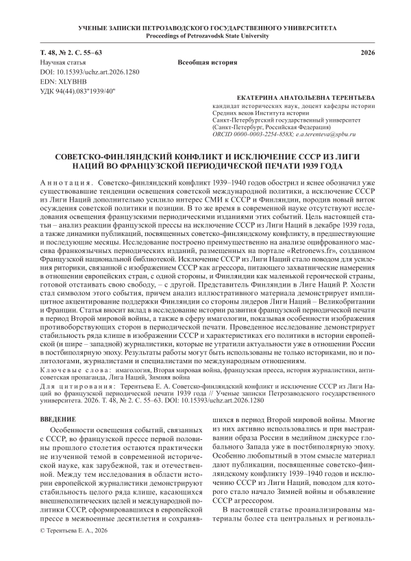 Советско-финляндский конфликт 1939–1940 годов обострил и яснее обозначил уже существовавшие тенденции освещения советской международной политики, а исключение СССР из Лиги Наций дополнительно усилило интерес СМИ к СССР и Финляндии, породив новый виток осуждения советской политики и позиции. В то же время в современной науке отсутствуют исследования освещения французскими периодическими изданиями этих событий. Цель настоящей статьи – анализ реакции французской прессы на исключение СССР из Лиги Наций в декабре 1939 года, а также динамики публикаций, посвященных советско-финляндскому конфликту, в предшествующие и последующие месяцы. Исследование построено преимущественно на анализе оцифрованного массива франкоязычных периодических изданий, размещенных на портале «Retronews.fr», созданном Французской национальной библиотекой. Исключение СССР из Лиги Наций стало поводом для усиления риторики, связанной с изображением СССР как агрессора, питающего захватнические намерения в отношении европейских стран, с одной стороны, и Финляндии как маленькой героической страны, готовой отстаивать свою свободу, – с другой. Представитель Финляндии в Лиге Наций Р. Холсти стал символом этого события, причем анализ иллюстративного материала демонстрирует имплицитное акцентирование поддержки Финляндии со стороны лидеров Лиги Наций – Великобритании и Франции. Статья вносит вклад в исследование истории развития французской периодической печати в период Второй мировой войны, а также в сферу имагологии, показывая особенности изображения противоборствующих сторон в периодической печати. Проведенное исследование демонстрирует стабильность ряда клише в изображении СССР и характеристиках его политики в истории европейской (и шире – западной) журналистики, которые не утратили актуальности уже в отношении России в постбиполярную эпоху. Результаты работы могут быть использованы не только историками, но и политологами, журналистами и специалистами по международным отношениям.