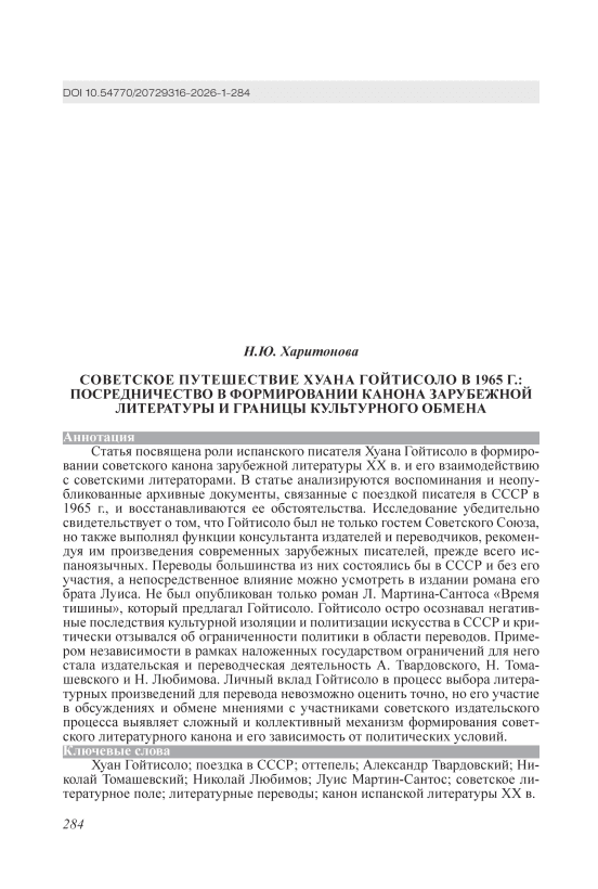 This article examines the role of the Spanish writer Juan Goytisolo in shaping the Soviet canon of twentieth-century foreign literature, as well as his interactions with Soviet literary figures. Drawing on memoirs and unpublished archival materials from the writer’s 1965 visit to the USSR, the study recounts the circumstances of this trip and reveals that he was not merely a guest but also served as an advisor to Soviet literary institutions and individuals, recommending works by contemporary foreign authors, particularly those writing in Spanish. While most translations were undertaken independently of his influence, his direct involvement is evident in the publication of his brother Luis’ novel. A notable exception, however, was Luis Martín-Santos’s “Time of Silence”, which remained untranslated due to its perceived “complexity” despite his efforts. Goytisolo sharply criticized the USSR’s cultural isolation and the politicization of art, highlighting the restrictive nature of Soviet translation policies. He identified figures such as A. Tvardovsky, N. Tomashevsky, and N. Lyubimov as exemplars of independence within state-imposed constraints, particularly through their publishing and translation work. Although Goytisolo’s personal influence on text selection cannot be precisely measured, his participation in discussions with Soviet publishers and literary figures underscores the complex and collective mechanism of the formation of the Soviet literary canon and its dependence on political conditions.