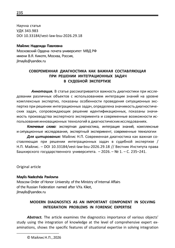 Современная диагностика как важная составляющая при решении интеграционных задач в судебной экспертизе