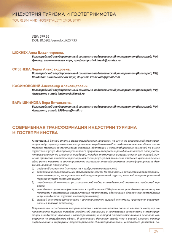 С применением методов теоретического, статистического, нормативного анализа и синтетического обобщения исследовались основные направления современной трансформации индустрии туризма и гостеприимства.