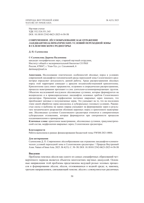 Цель работы — изучить генетические особенности лёссовых пород в условиях современной ландшафтно-геохимической среды переходной зоны Селенгинского среднегорья.