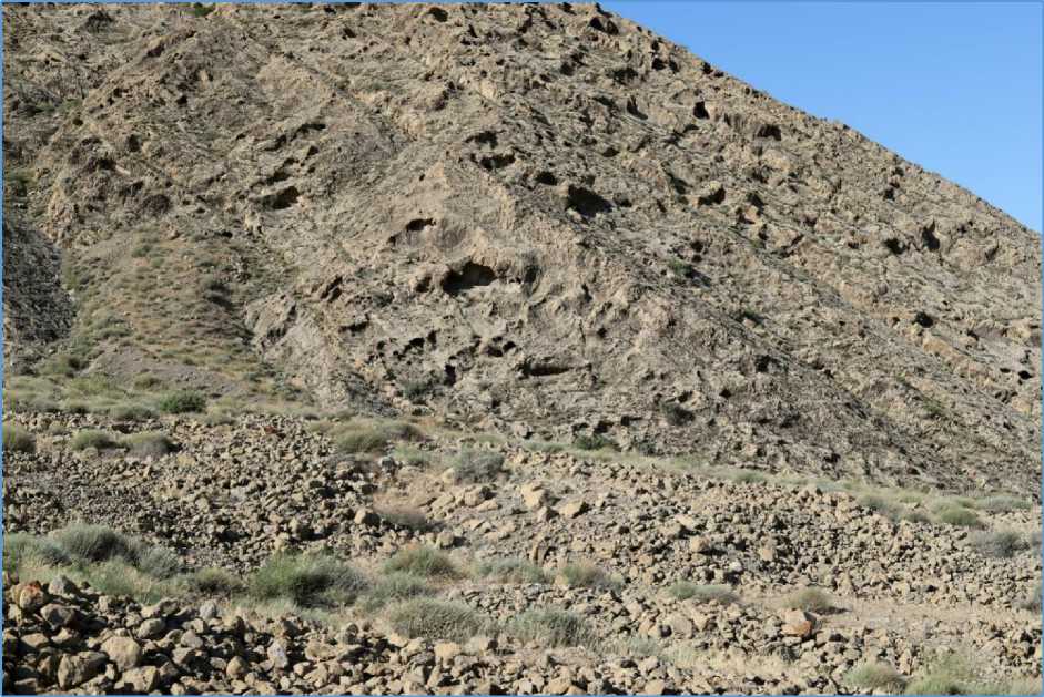 Южная предгорная часть представляет собой сильно всхолмленную равнину. Холмогорья, сложенные пестроцветными палеогеновыми глинами с весьма скудной растительностью – бедленды (рис. 4), представители которой чаще всего гипсофиты и галофиты, занимают всю южную часть и подходят вплотную к главному хребту, в нижней части склонов которого также отмечаются выходы палеогеновых глин (рис. 5). Склон достаточно пологий и эдификатором сообществ является Zygophyllum atriplicoides с небольшим набором травянистых монокарпиков. Вблизи немногих родников (ур. Чалсу и Торонгылы) отмечены небольшие рощицы Populus euphratica Olivier и единичные угнетённые особи Salix excelsa S. G. Gmel. Северные склоны главного хребта Малого Балхана довольно крутые и труднодоступные. Скалистые склоны изрезаны глубокими ущельями, поднимающимися до платообразной верхушки хребта (рис. 8).