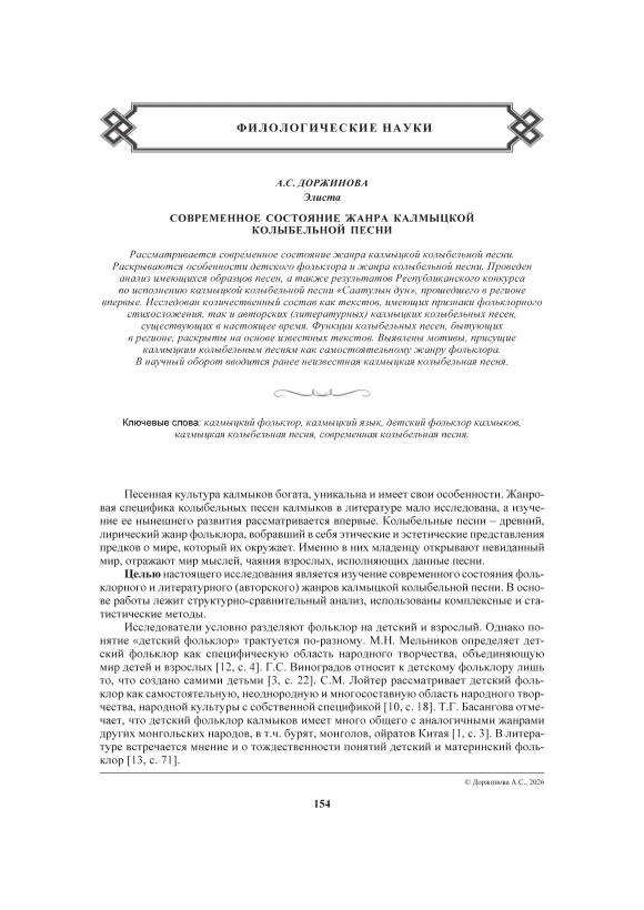 Рассматривается современное состояние жанра калмыцкой колыбельной песни. Раскрываются особенности детского фольклора и жанра колыбельной песни. Проведен анализ имеющихся образцов песен, а также результатов Республиканского конкурса по исполнению калмыцкой колыбельной песни «Саатулын дун», прошедшего в регионе впервые. Исследован количественный состав как текстов, имеющих признаки фольклорного стихосложения, так и авторских (литературных) калмыцких колыбельных песен, существующих в настоящее время. Функции колыбельных песен, бытующих в регионе, раскрыты на основе известных текстов. Выявлены мотивы, присущие калмыцким колыбельным песням как самостоятельному жанру фольклора. В научный оборот вводится ранее неизвестная калмыцкая колыбельная песня.