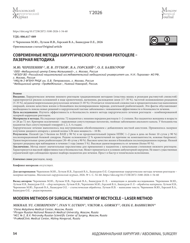 Введение. Хирургическое лечение нижнего ректоцеле традиционными методами (пластика мышц и резекция растянутой слизистой) характеризуется риском осложнений в виде кровотечения, нагноения, расхождения швов (17–30 %), частотой возникновения рецидивов (5–35 %), неудовлетворительными результатами лечения (5–85 %). Отличается технической сложностью и продолжительностью выполнения операций, низким качеством жизни в ближайшем послеоперационном периоде, длительной реабилитацией. Эти факты обуславливают необходимость поиска новых решений в хирургической тактике заболевания с повышением эффективности и безопасности лечения. Цель исследования. Изучить эффективность и безопасность нового метода хирургического лечения ректоцеле – комбинированной лазерной коррекции ректоцеле. Материалы и методы. Исследуемая группа: 72 пациентки с нижним передним ректоцеле 1–2 степени. Все пациентки женщины в возрасте от 28 до 72 лет. Критерии исключения – выраженная сопутствующая патология, гнойные заболевания анального канала. У большинства пациенток был сопутствующий геморрой 1, 2, 3, 4 стадии. Хирургическое лечение выполнялось под внутривенным обезболиванием с добавлением местной анестезии. Применялось лазерное излучение диодного аппарата с длиной волны 1,56 мкм мощность – 10 Вт. Результаты. Низкий (до 5 баллов по ВАШ у 90 %) и не продолжительный (прием НПВС 1–2 раза в день не более 10 суток у 90 %) послеоперационный болевой синдром. Редкие осложнения (2 % кровотечений по причине не комплаентности, кожные бахромки). Удовлетворительные сроки реабилитации (30–40 суток у 90 %). Высокое качество жизни в ближайшем послеоперационном периоде. Низкий процент рецидива при наблюдении в течении 1 года (менее 5 %). Высокая удовлетворенность от лечения (более 95 %). Заключение. Метод имеет значительные перспективы для применения у пациенток с начальными степенями нижнего ректоцеле. Характеризуется высокой эффективностью и безопасностью. Может применяться в условиях амбулаторной хирургии. Не имеет существенных ограничений при соблюдении правил подбора пациентов для лечения. Прост и быстр в техническом исполнении.