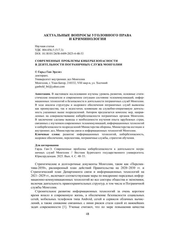 В настоящем исследовании изучены уровень развития, основные стати- стические показатели и современное ситуации состояние телекоммуникаций, инфор- мационных технологий и безопасности в деятельности пограничных служб Монголии. В ходе анализа структуры и кадрового обеспечения пограничных служб выявлены как преимущества, так и недостатки, влияющие на служебно-оперативную деятель- ность указанных выше подразделений. Автором предлагается комплекс мер, направленных на совершенствование кибербезопасности пограничных органов Монголии. В заключение сделаны выводы о необходимости изучения опыта зарубежных стран, связанных с изучением современных телекоммуникаций, информационных технологий и кибербезопасности подразделений Министерства обороны, Министерства юстиции и внутренних дел, Министерства связи и информационных технологий Монголии.