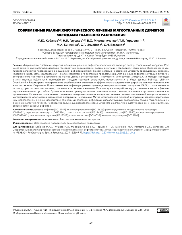 Cite as: Kabanov M.Yu., Glushkov N.I., Miroshnichenko V.O., Gorshenin T.L., Binienko M.A., Izmaylov S.G., Bogdanov S.N. Current approaches to surgical treatment of soft tissue defects using tissue expansion techniques. Bulletin of the Medical Institute “REAVIZ”: Rehabilitation, Doctor and Health. 2025;15(5):69-77.