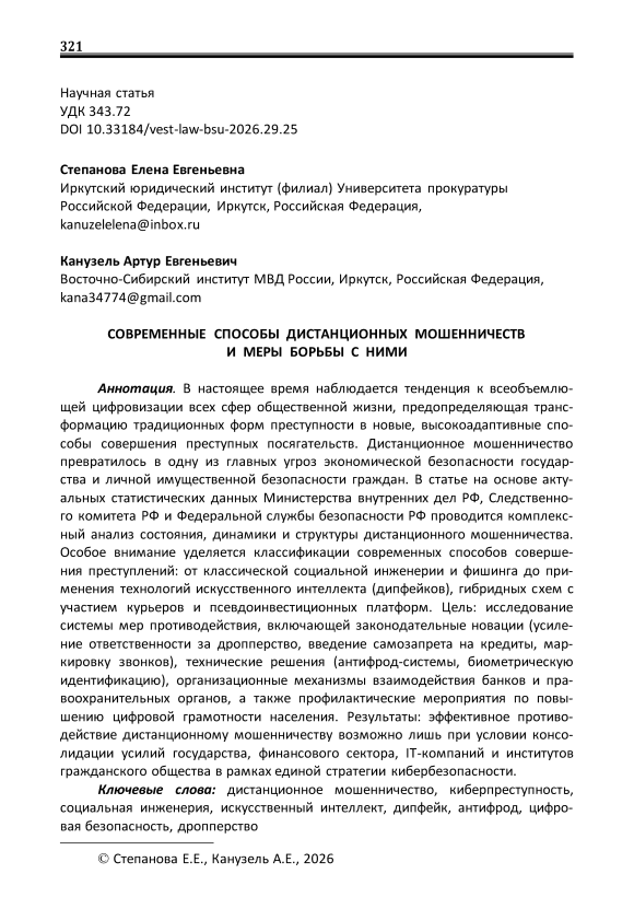В настоящее время наблюдается тенденция к всеобъемлющей цифровизации всех сфер общественной жизни, предопределяющая трансформацию традиционных форм преступности в новые, высокоадаптивные способы совершения преступных посягательств. Дистанционное мошенничество превратилось в одну из главных угроз экономической безопасности государства и личной имущественной безопасности граждан. В статье на основе актуальных статистических данных Министерства внутренних дел РФ, Следственного комитета РФ и Федеральной службы безопасности РФ проводится комплексный анализ состояния, динамики и структуры дистанционного мошенничества. Особое внимание уделяется классификации современных способов совершения преступлений: от классической социальной инженерии и фишинга до применения технологий искусственного интеллекта (дипфейков), гибридных схем с участием курьеров и псевдоинвестиционных платформ. Цель: исследование системы мер противодействия, включающей законодательные новации (усиление ответственности за дропперство, введение самозапрета на кредиты, маркировку звонков), технические решения (антифрод-системы, биометрическую идентификацию), организационные механизмы взаимодействия банков и правоохранительных органов, а также профилактические мероприятия по повышению цифровой грамотности населения. Результаты: эффективное противодействие дистанционному мошенничеству возможно лишь при условии консолидации усилий государства, финансового сектора, IT-компаний и институтов гражданского общества в рамках единой стратегии кибербезопасности.