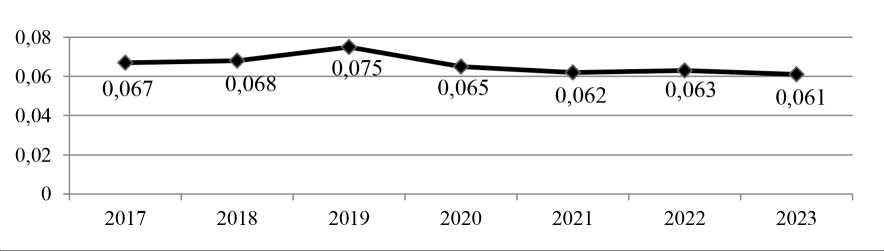 Несмотря на положительные изменения в сфере государственного регулирования развития сельского хозяйства, существуют тенденции снижения качества государственной поддержки отрасли, что подтверждается динамикой исследуемого показателя (объемов финансирования) в расчете на 1 рубль стоимости произведенной сельскохозяйственной продукции (рис. 2). На протяжении 2017-2023 гг. исследуемый показатель варьировал в пределах 0,061-0,075 ед., достигнув максимального значения в 2019 г. (0,075 ед.), что объясняется необходимостью повышения уровня обеспечения продукта- ми питания населения в период пандемии. В последующем показатель снизился за счет роста объемов производства сельскохозяйственной продукции (на 67%) на фоне снижения размеров бюджетного финансирования отрасли в 2023 г. и составил 0,061 ед., что на 0,014 ед. меньше показателя 2019 г.
