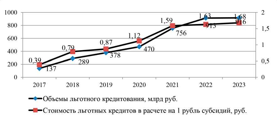 действующих механизмов государственной поддержки и повышения финансово-экономической самодостаточности сельскохозяйственных предприятий является льготное кредитование, в рамках которого предусмотрено субсидирование процентных ставок по кредитам (в т. ч. инвестиционным) и установление приоритетных направлений их использования. Начиная с 2017 г. в рамках реализации Программы льготного кредитования сельскохозяйственных товаропроизводителей ставка по кредитам составляла до 5%, при которой объемы кредитования предприятий составили 137 млрд руб. (рис. 3). В связи с инфляционными процессами, ростом себестоимости сельскохозяйственного производства и потребностью в инвестиционном развитии предприятий объемы льготного кредитования в 2023 г. достигли 916 млрд руб., что более чем в 6 раз больше уровня 2017 г.