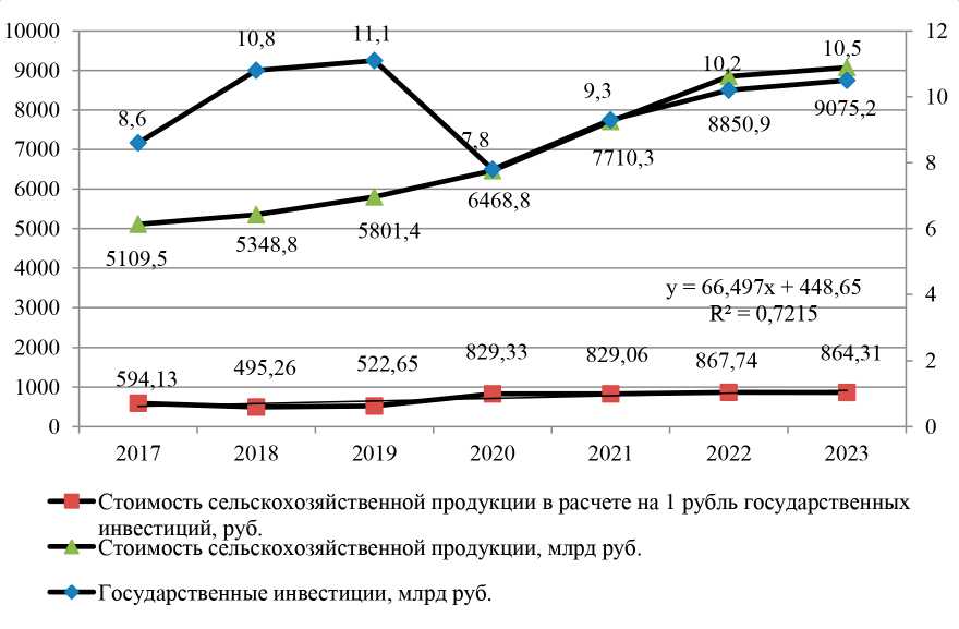 Выявленные изменения обусловили увеличение объемов производства сельскохозяйственной продукции, что подтверждается соответствующими значениями показателя стоимости произведенной сельскохозяйственной продукции в расчете на 1 рубль государственных инвестиций (рис. 4). Так, анализируемый показатель в 2023 г. увеличился на 46% и составил 864,31 руб., что свидетельствует об эффективности государственного инвестирования и его роли в развитии сельскохозяйственного производства. Уровень апроксимации (R2=0,72)