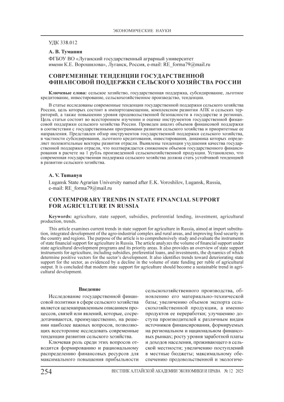 Сельское хозяйство, государственная поддержка, субсидирование, льготное кредитование, инвестирование, сельскохозяйственное производство, тенденции
