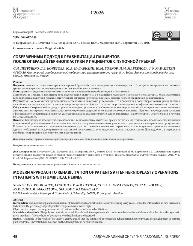 Введение. Количество пациентов с грыжами передней брюшной стенки ежегодно неуклонно возрастает. Несмотря на внедрение новых методик грыжесечения процент послеоперационных осложнений остается высоким. Цель: сравнить отдаленные результаты пациентов с проведенной реабилитацией и без таковой. Материалы и методы. В полицентровое исследование включены 58 пациентов мужского и женского пола которым была выполнена герниопластика пупочной грыжи синтетическим сетчатым протезом. Описаны методы послеоперационной реабилитации. Результаты. По результатам проведенного исследования возможно утверждать, что проведенная послеоперационная реабилитация способствует предотвращению развития синдрома хронической боли. На развитие рецидива грыжи профилактика влияния не оказала. Обсуждение. Современный подход к срокам и методам проведения реабилитационных мероприятий после герниопластики позволяет значимо снизить процент отдаленных послеоперационных операций и улучшить состояние пациента. При этом необходимым условием эффективности реабилитации является самостоятельное выполнение рекомендация пациентам на амбулаторном этапе лечения в течение не менее 2 месяцев. Выводы. Как показало проведенное исследование, герниопластика пупочной грыжи сетчатым синтетическим протезом с последующей предложенной реабилитационной программой позволяет говорить о значительном улучшении отдаленных послеоперационных результатов. Количество включенных в исследование пациентов и рассмотрение исключительно герниопластики при пупочных грыжах не позволяет сделать глобальный вывод о применения описанной программы ко всем пациентам после пластики грыжи. Для подобного утверждения необходимо проведение дополнительных исследований.