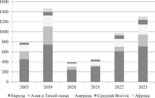 Рис. 1.1 Глобальное территориальное ра пределение количества въездов иностранных туристов в период 2005–2023 гг., млн