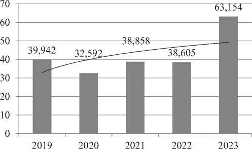 Средний бюджет летнего отпуска на человека в РФ колебался. Максимального значения показатели достигли в 2023 году - около 63 200 руб)лей. Для сравнения, в 2022 году средний бюджет отпуска составлял около 38 600 рублей на человека (рис. 7).